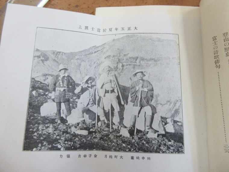 | 写真の上には 「大正5年夏 於富士頂上」 写真下には 「強力 金子幸吉 大町桂月 田中桃葉」 ※強力・・昔、富士山などで荷物を運び、道案内をした人をいう。 田中桃葉・・桂月の唯一人の弟子・本名は田中貢太郎 |
