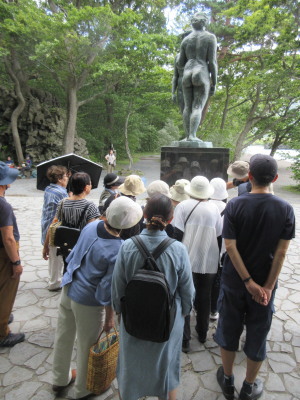 ![]() 渕沢の歌碑 →焼山の歌碑 →奥入瀬渓流 →十和田神社 →乙女の像 →銚子大滝 佐藤春夫の碑 → 桂月の墓参り → 蔦温泉 と巡りました。 初回訪問で桂月さんが、十和田湖、奥入瀬渓流と蔦温泉で費やした日数は6日。それを一日で巡るのはとても無理なことでした。 十和田湖畔休屋では桂月も訪ねた十和田神社でお参りの後、乙女の像が桂月、武田千代三郎青森県知事、小笠原耕一十和田村長の十和田開発三氏の顕彰碑であることもみていただきました。 お昼の弁当には桂月の好物ワラビをいれていただき、ワラビのお菓子「桂月糖」が七戸町で作られていたことも紹介しました。 |
